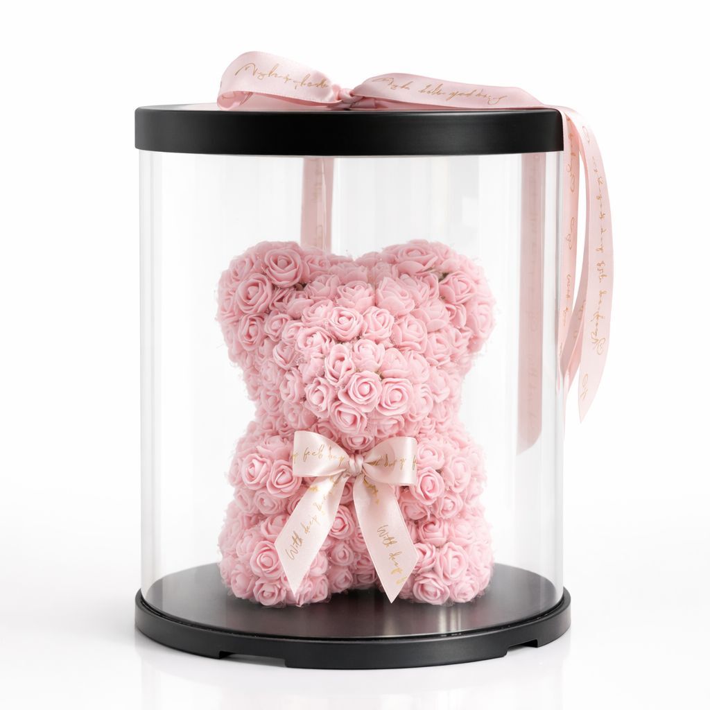 Şeffaf silindir kutuda hazırlanan pempe gül ayıcıklı romantik Sevgililer günü hediyesi.Kutu ölçüleri 30x21.