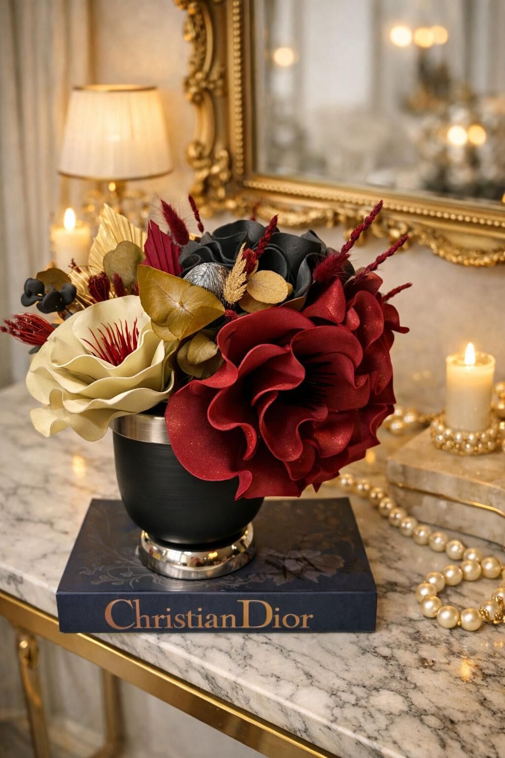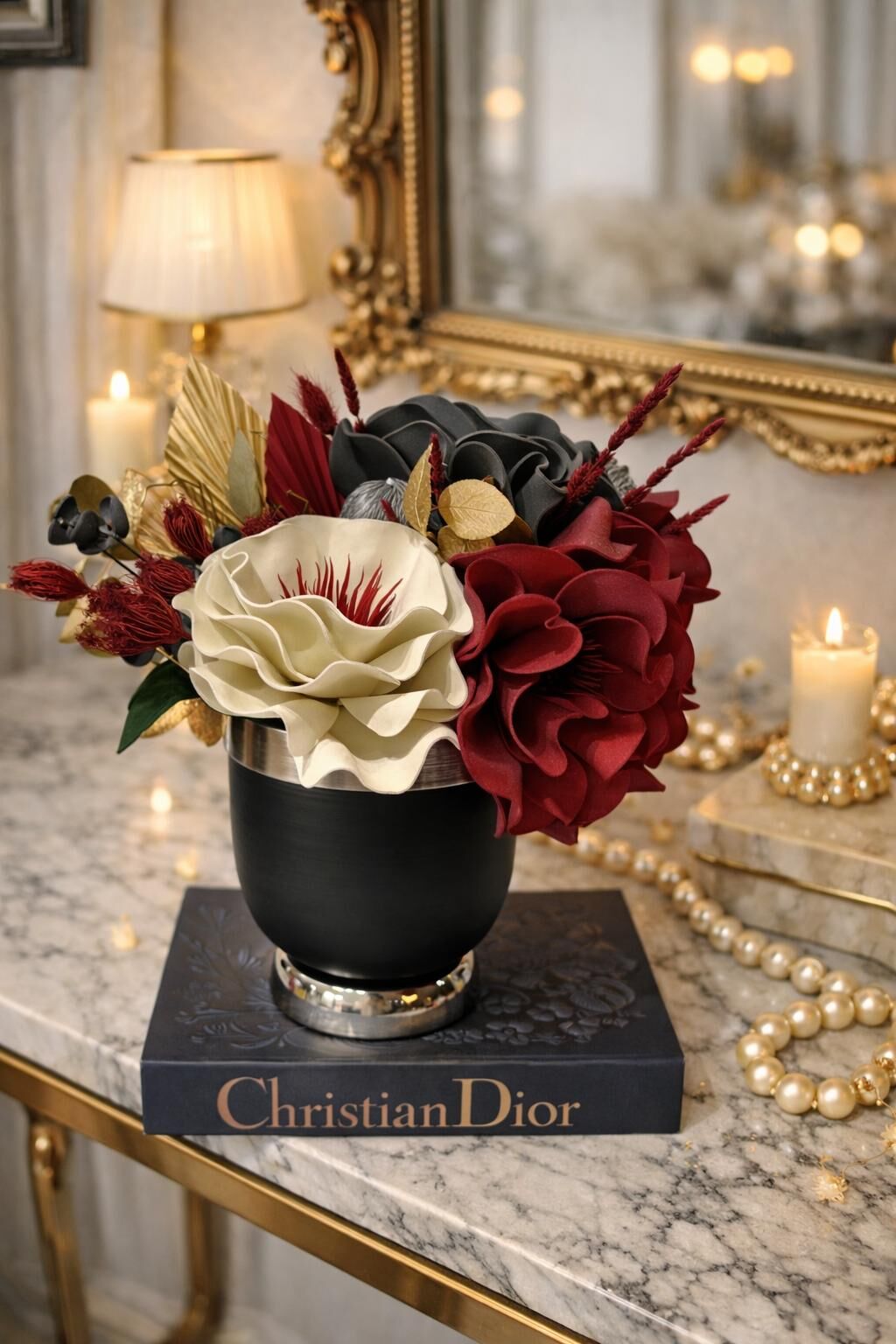Metal vazo üzerine lüks lateks çiçeklerle hazırlanan aranjman.Uzun ömürlü,bakım gerektirmez.Salon,ofis ve özel gün hediyesi için harika bir ürün.